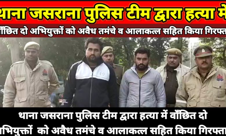 थाना जसराना पुलिस टीम द्वारा हत्या में वाँछित दो अभियुक्तों को अवैध तमंचे व आलाकत्ल सहित किया गिरफ्तार