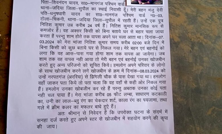 *पूरा मामला:* जदिया थाना जिला सुपौल के रहने वाले नंदकिशोर कुमार पिता शिवनंदन यादव ने बताया कि मेरी बहन मंजू देवी पति धनुषधारी यादव मनगंज पश्चिमी वार्ड नंबर 3 टोला चिकनी थाना जदिया जिला सुपौल में रहते हैं उनका पुत्र नीतीश कुमार उम्र करीब 24 वर्ष मानसिक रूप से कमजोर हैं वह अक्सर किसी को बिना बताए घर से बाहर चले जाया करते हैं शाम तक घर वापस भी आ जाती थे दिनांक *7/3 /2024* को मेरा भांजा नीतीश कुमार समय करीब *2:00* बजे दिन में बिना किसी को बताएं घर से निकल गया है मेरे बहन एवं बहेनोई को लगा है कि आसपास गया होगा शाम तक वापस आ जाएगा जब शाम तक वापस नहीं आया तो मेरी बहन एवं बहनोई ने उसकी खोजबीन करते हुए अपने परिजनों को सूचना दी हम लोग अपने परिवार के लोगों के साथ खोजबीन करने लगे खोजबीन के क्रम में दिनांक *8/3 /2024* को उन्हें नरपतगंज अररिया से झिंगली चौक के पास देखा गया था